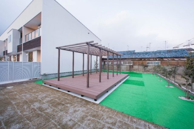 物件には3つの特徴を持たせている。1つ目は6戸建設可能な敷地に5戸の住戸を建設することで敷地に余裕を持たせ、バーベキューなどに使用できるプライベートコート(居住者専用の公園)を併設したこと。2つ目は各戸の専有面積に余裕を持たせ3LDKとし、各戸に2台分の駐車場も確保したこと。3つ目は分譲住宅と同等の住宅設備を実装したこと。