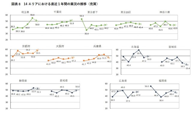 首都圏では、埼玉県・千葉県・東京都下で上昇し、埼玉県のDI=55.0は調査開始以来最高。千葉とともに全調査項目のDIで前期比がプラスになった。東京23区・神奈川県は、前年比マイナスとなる。首都圏・近畿圏以外では、北海道・宮城県が低下。広島県・福岡県が改善している。静岡県は堅調に推移していたが、今期は調査以来最高のDI=52・9となる。来期の見通しでは、千葉県・京都府・静岡県がDI=50を超えている。