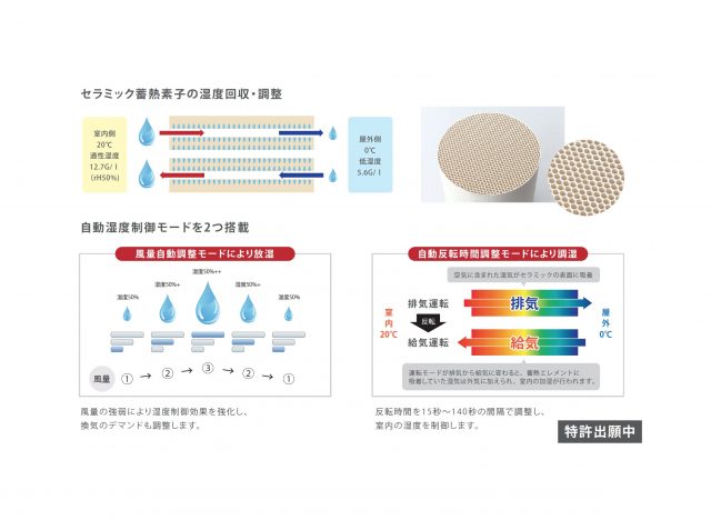 調湿モードは、反転時間を15〜140秒の間隔で変えて調湿する「自動反転時間調整モード」、風量の強弱により放湿する「風量自動調整モード」の2つ。