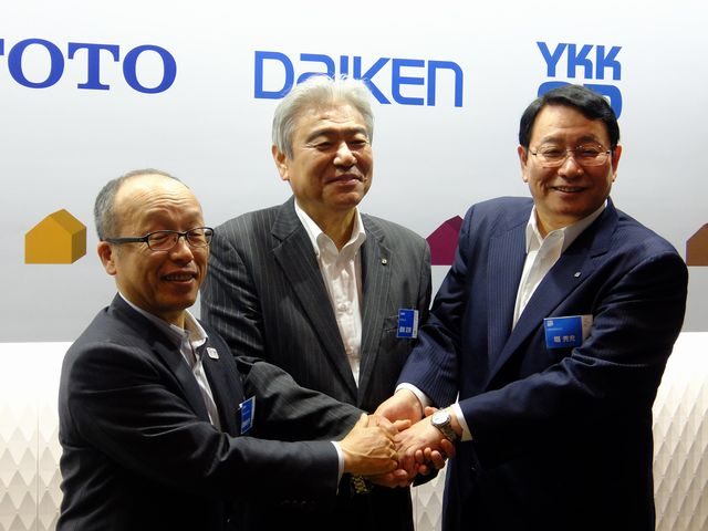 5月17日、開会に先立ちオープニングセレモニーとメディア向けの内覧会が開催された。3社代表が固く握手を交わした。左からTOTO・喜多村円社長、大建工業・億田正則社長、YKK AP・堀秀充社長