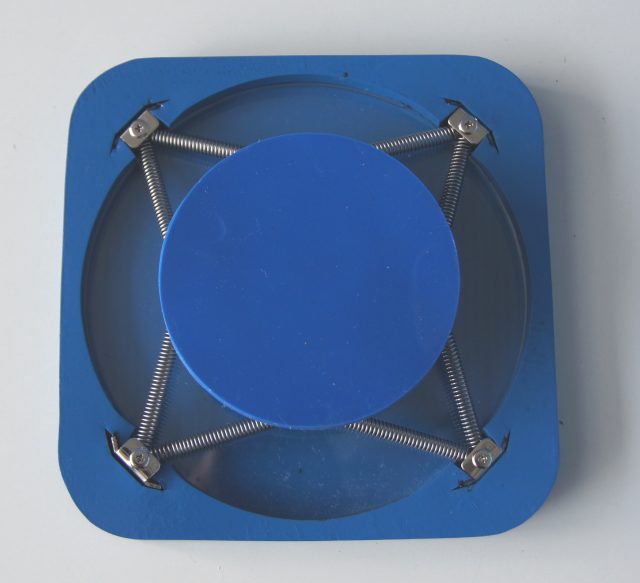地震の揺れによる被害を軽減する室内用免震装置「グラレス」(2015年11月から販売開始)をさらに小型化し、形状を丸型から四角に変更したもの。サイズは約145x145x43mm(設置部分φ81mm)、可動範囲52mm。