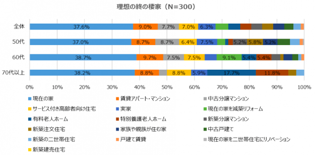 続いて「理想の終の棲家」について聞いたところ、最も多かった回答は『現在の家』(37.6%)だった。年代別では、50代でそれぞれ1.1%、1.7%だった『有料老人ホーム』『特別養護老人ホーム』が、70代以上になると17.7%、11.8%と大幅に増加した。『新築建売住宅』は全ての年齢で0.0%だった。