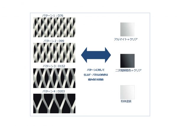 シリーズ第1弾は、メッシュ状の内外装用アルミ建材「エキスパンド・メタル」。千鳥状に入れた刻み巾をひし形や亀甲型に圧延したメッシュ状金属板をエキスパンド・メタルといい、今回はデザイン性を意識し、刻み巾の広い4パターンの網目を用意した。仕上げは3種類。網目パターン、仕上げ、パネルの向きは自由に組み合わせ可能で、サイズは標準幅890x長さ1790、最大幅1200x長さ4000mm。