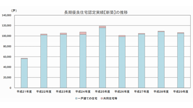 国土交通省は5月25日、「長期優良住宅の普及の促進に関する法律」に基づく長期優良住宅建築等計画の認定状況(2018年3月末時点)を発表した。2017年度の新築に係る認定状況は、戸建て住宅が10万80戸、共同住宅等が1531戸で、合計10万6611戸。2016年度比で約2.5%減った。制度が開始された2009年度からの累計戸数は一戸建て、共同住宅合わせて91万5104戸となった。