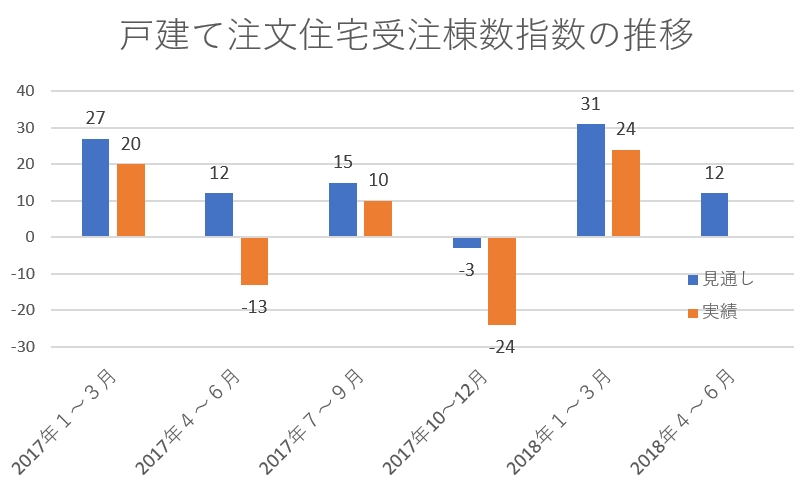 住宅生産団体連合会(東京都千代田区)は5月29日、2018年1月~3月の住宅業況調査の結果を報告した。戸建て注文住宅の全国の受注実績は前四半期(2017年10月~12月)に対してプラス24ポイント、総受注金額はプラス12ポイントとなり、棟数、金額ともに前四半期のマイナスからプラスに転じた。