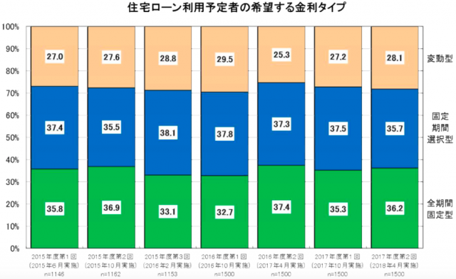 利用予定の金利タイプ構成比は、「固定期間選択型」が35.7%で前回調査(37.5%)に比べて減少、「変動型」と「全期間固定型」がそれぞれ28.1%(前回=27.2%)、36.2%(同=35.3%)で増加した。