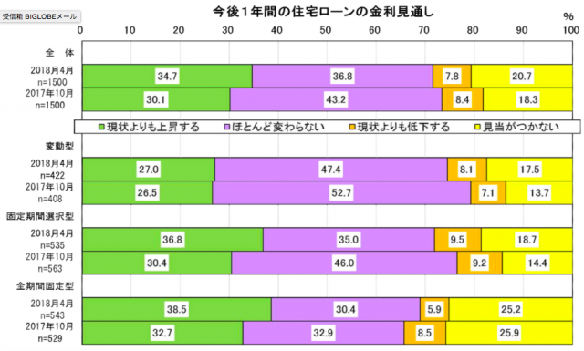 今後1年間の住宅ローンの金利見通しは、「ほとんど変わらない」が36.8%(前回=43.2%)に減少、「現状よりも上昇する」が34.7%(同=30.1%)に増加した。金利タイプ別に見ると、各金利タイプで全体と共通する傾向が見られる一方、 「変動型」「固定期間選択型」では「現状よりも低下する」や「見当がつかない」が増加、「全期間固定型」では「現状よりも低下」が減少した。