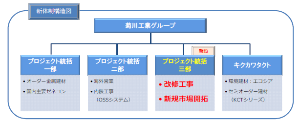 新設されたのは、「プロジェクト統括三部」(下図参照)。これまで、プロジェクト統括一部では国内主要ゼネコン向けのオーダー金属建材を、プロジェクト統括二部では海外営業や内装工事を手がけてきた。改修に関してはグループ会社であるキクカワタクトが30年にわたり担ってきたが、この度その改修部門を統合、スタッフを増員して「プロジェクト統括三部」とした。オフィスビルの改修やリノベーション工事、ビルや商業施設などのテナント更新のための改修、イメージチェンジを目的としたリニューアル工事などさまざまなストックに対応していく。