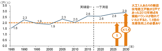 同社は2030年の新設住宅着工を約60万戸と推測しており、大工1人あたり年2.9戸。今後は新設住宅着工戸数の減少幅を、大工の人数の減少幅が上回ることになり、生産性の向上が求められるとしている。