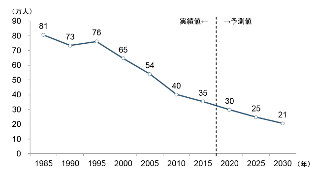 野村総合研究所(東京都千代田区)は、大工の人数が2030年に21万になるとの予測を発表した。大工の高齢化、産業間の人材獲得競争の激化などの影響により減少が進むとの見方を示した。