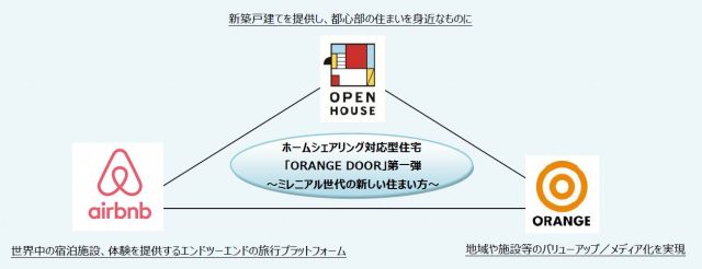 6月15日の住宅宿泊事業法の施行によりホームシェアリングの活性化や新たな生活・住居スタイルの広がりが見込まれる。販売する「ホームシェアリング対応型住宅」とは、オレンジが「旅人を迎え入れるフレンドリーな住居」としてプロデュースした「オレンジドア」の第一弾の戸建住宅である。2018年12月末まで、東京都・神奈川県および名古屋市内の唯一のAirbnb公式デザイン住宅としてAirbnbプラットフォームに掲載予定。