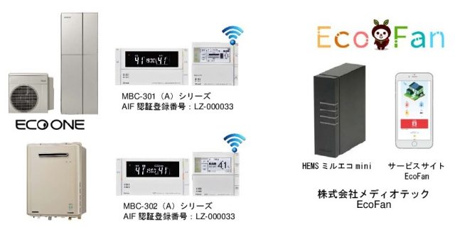 リンナイ(名古屋市)が販売するECO ONE(エコワン)用リモコンMBC-301(A)シリーズ、ガス給湯器用リモコンMBC-302(A)シリーズが、メディオテック(東京都新宿区)のHEMSサービス「EcoFan(エコファン)」とHEMS接続連携する。2018年度「ZEH+実証支援事業」の追加要件の一つ「HEMSと給湯設備が接続すること」を満たすもの。