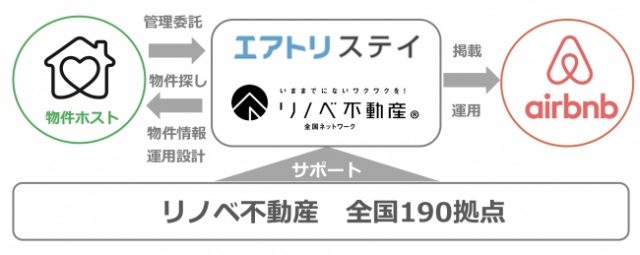 「リノベ不動産STAY」ブランドのもと、同社が「リノベ不動産.com」でのデジタルマーケティング力を生かした投資家への民泊物件選びからリノベーション、エアトリステイが住宅宿泊管理事業者として民泊運営代行を担う。全国190拠点超のリノベ不動産加盟店と連携してサービス展開する。