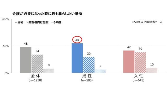 リサーチ・アンド・ディベロプメント(東京都新宿区)は、首都圏在住の50代以上既婚者1230人を対象に、「人生100年時代」の男女における意識差やその要因を調査した。介護時に最も暮らしたい場所は、男性は「自宅」が55%、「高齢者向け施設」が30%と「自宅派」が25ポイント上回った。女性は「自宅」が42%、「高齢者向け施設」が39%と「自宅派」と「高齢者向け施設派」に大きな違いがなかった。男女で意識の差がある。