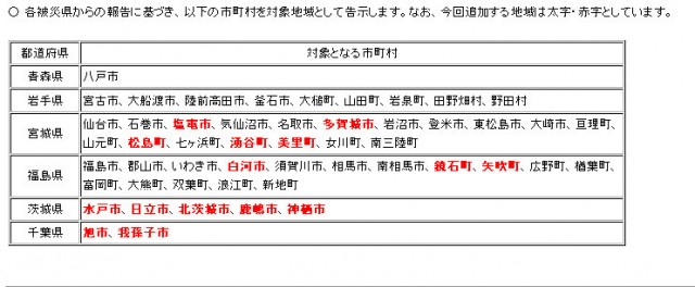 新告示により新たに対象となった地域は、宮城県が塩竃市、多賀城市など5市町、福島県が白河市・鏡石町など3市町のほか、茨城県で水戸市・日立市など5市、千葉県で旭市・我孫子市の2市。