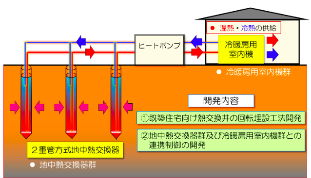 同技術は、浅層地中熱利用システムの地中熱交換器で使用する鋼管を回転させながら地中に貫入させていく新たな施工法と、地中熱交換器群と冷暖房用室内機群を連携制御するヒートポンプシステム制御技術によって低コスト化を実現するもの。最終目標である導入コスト40%減と運用コスト10%減を達成できる見込みを確認した。