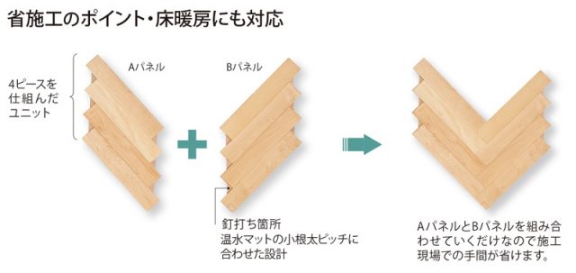 新商品は、4ピースを雁行に並べて、合板で裏打ちすることによって、1ピースずつ張るのに比べて施工時間を約4分の1に短縮。表面には約2mmの挽き板を使って重厚感を出している。床暖房にも対応。