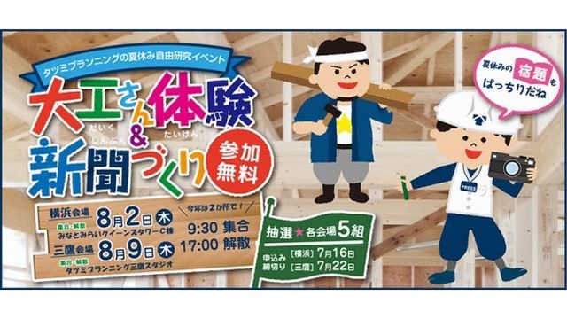 タツミプランニング(横浜市)は、小学生を対象とした夏休み自由研究イベント「大工さん体験&新聞づくり」を開催する。8月2日に横浜会場、8月9日に三鷹会場で、それぞれ開催。参加定員は各会場5組を予定しており、参加費は無料。申し込みは同社のウェブサイトで受け付けている。