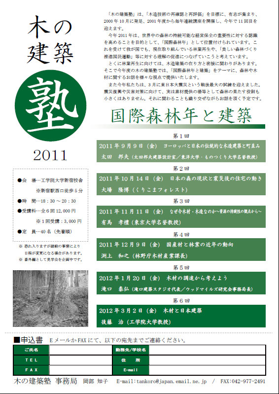 木造技術の再確認と再評価を目標に有志でつくる任意団体・木の建築塾は、国連が2011年を国際森林年と定めたことにあわせ、林業再生や美しい森づくりにおける建築の役割についてのシリーズ講演会を今年9月から来年3月まで全6回にわたって開催する。