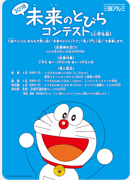 7月25日から8月31日まで、子どもたちが思い描く“未来のとびら”「ドア」「窓」「門」「庭」などを募集。金賞、銀賞、特別賞の受賞者には、ドラえもんぬいぐるみなどの各賞特典のほか、「アルミ製オリジナルドラえもん受賞メダル」が進呈される。結果は、9月下旬にホームページにて発表予定。