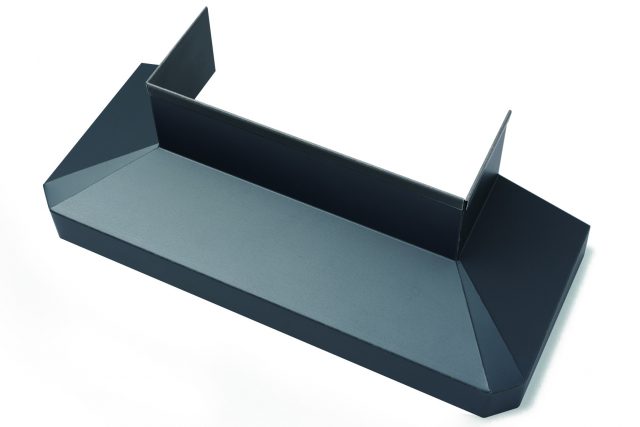 鋼板製の出隅部材。見付け幅18mmの「WM防鼠付スリム水切り」とあわせて玄関などの袖壁部分に使用することで、継ぎ目のない美しい仕上がりが可能になる。また、これまで役物2個と本体の短尺で納めていた手間を削減することができる。