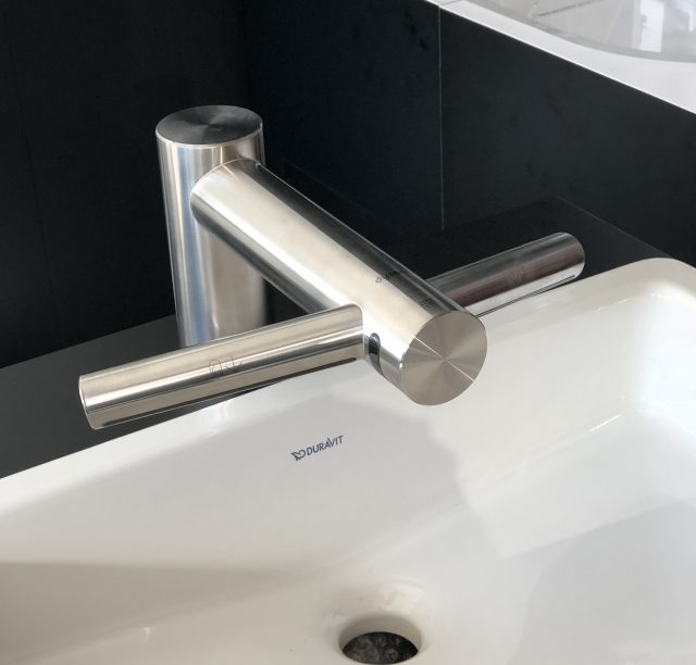 新商品は、ハンドドライヤーを一体化した洗面用水栓。水栓の両端に2本のアームが張り出したユニークな形状になっており、この両端のアームがハンドドライヤーの役目を果たす。