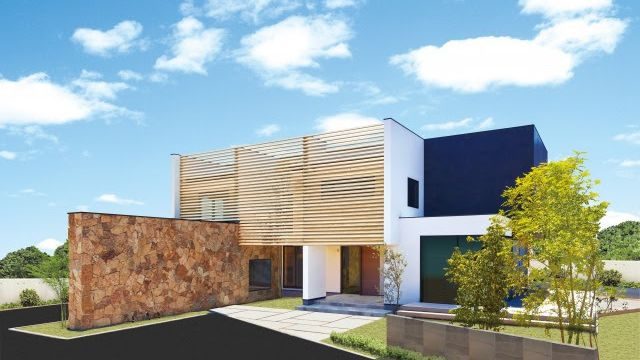 「直線美と木と石の調和」をコンセプトとした同展示場は、ボックス型のモダンスタイルな外観。存在感のあるウイング(袖壁)へ自然石を取り入れ、木製ルーバーで外観のデザイン性を追求した。ルーバーは外に対しては閉じ、内に対しては心地よさを演出している。内部は常に自然を感じられる空間設計となっており、LDKや和室からはそれぞれの庭を眺めることができる。