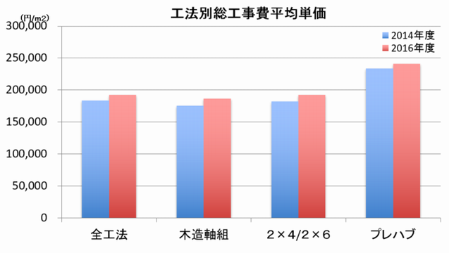 工法別にみると、木造軸組工法が前回調査比1万1018円(6.3%)増の18万6618円/m2、木造2x4/2x6工法が同1万513円(5.8%)増の19万2853円/m2、プレハブ工法が同6981円(3.0%)増の24万911円/m2となった。