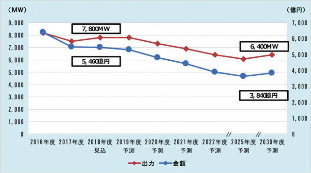 2017年度の太陽電池国内市場は、改正FIT法の施行に伴う認定の遅れや施工・販売側で法改正の対応に追われるなどの混乱が生じ、その影響を工期の短い住宅用や低圧用が受けたことで、市場が縮小した。2018年度以降は、6000〜7000MWで推移すると予想する。また、脱FITに向けて自家消費を促進する動きが今後の市場を左右すると指摘する。2018年度見込は金額ベースが5460億円、出力ベースが7800MW、2030年度は金額ベースが3840億円、出力ベースが6400MWと予測する。