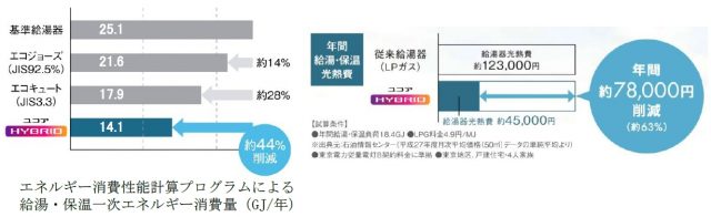 試算では、従来給湯器(LPガス)と比べて、給湯・保温にかかる光熱費を年間約63%・約7万8000円削減できるとする。