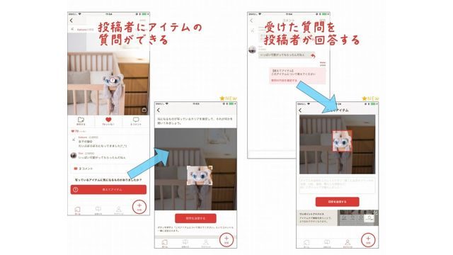 ユーザーは、投稿された実例写真上の範囲を指定することで、気になる家具や雑貨などのアイテムについて、投稿者に気軽に質問できる。同機能により、ユーザーの商品を探す手間を省き、購買に関わる意思決定をスムーズにするという。