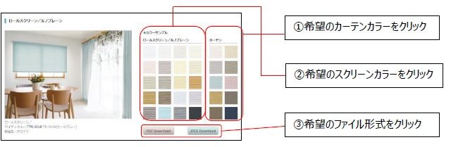 いずれもパソコンやタブレット端末の画面上で、スクリーン取り付け後のインテリアイメージを簡単に確認できるため、新築や部屋の模様替えの際に役立てることができる。色を変えながらわかりやすく説明できるため、カーテン販売の現場でも活用可能。シミュレーション画面は、PDFかJPEGのファイル形式でダウンロードでき、インテリアのプランボード制作にも使える。