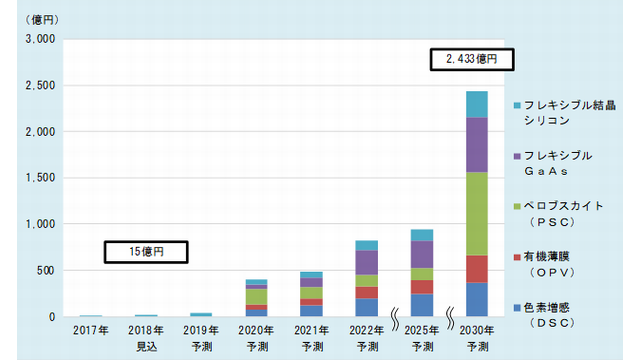 富士経済(東京都中央区)はこのほど、フレキシブル結晶シリコン、フレキシブルGaAs、ペロブスカイト、色素増感、有機薄膜といった、新型・次世代太陽電池市場について調査し、その結果を「新型・次世代太陽電池の開発動向と市場の将来展望」にまとめた。2030年の新型・次世代太陽電池市場は、2017年比で811.0倍の2433億円になると予測する。
