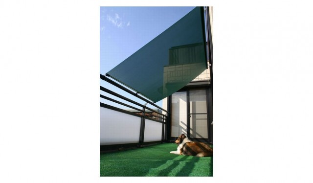 「住宅用エコスクリーン“まどかぜ”」は、ベランダやバルコニーに設置する屋外用のロールスクリーン。サイズは間口2m、高さ2mで、ベランダに面したアルミサッシ枠を利用して簡単に取り付けることができる。スクリーンの材質はポリエステル製で、国産のメッシュ地を採用。カラーは、ディープグリーンとクリームイエローの2色をそろえた。