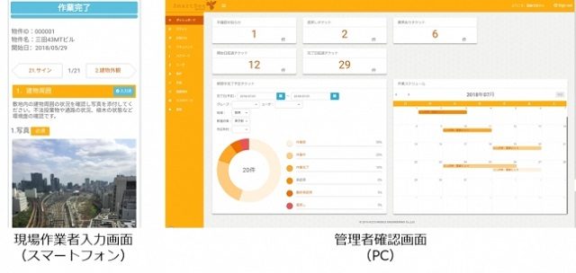 KCCSモバイルエンジニアリング(東京都港区)は8月1日、現場管理支援サービス「SmartBee(スマートビー)」に新たな機能を追加した。現場報告時に、動画、音声、手書きサイン、360度カメラ映像がアップロードできるようにしたほか、現場へ展開する際に作業別(作業マニュアル等)、物件別(図面、物件写真等)にアップロードできるよう対応した。
