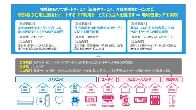 実証実験では、パナソニックのエアコンやセンサー、エーザイ(東京都文京区)が販売する服薬支援機器、関西電力の電力使用量のデータなどを通じて在宅高齢者の生活データを集め、高次データ処理を行うデータプラットフォームを構築。「生活実態の把握」「服薬の効果情報」「緊急駆け付けの必要性」を分析する。それらを地域包括支援センターや在宅介護事業者、薬局事業者といったモデル事業者に提供することで、高齢者の自立した生活の実現や多剤服用の適正化などにつなげるという。