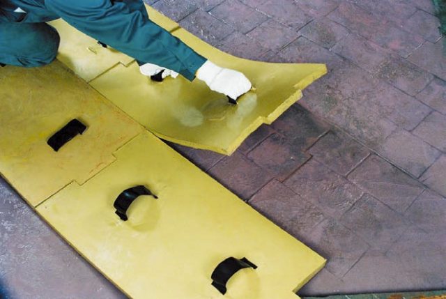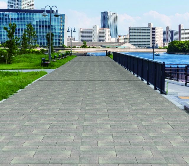 完全に硬化する前のコンクリートに2種類のカラー材(基本色・陰影色)で着色、パターンマット(押し型)を押し当てて表面に立体感のあるデザインを生み出すもの。レンガや石畳の床よりもコストパフォーマンスにすぐれ、工期短縮が可能になるという。