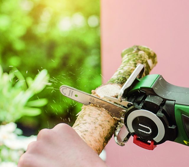 切断可能サイズは最大13cm。直線、90度の正確な切断が可能で、屋外での枝切りにも対応する。