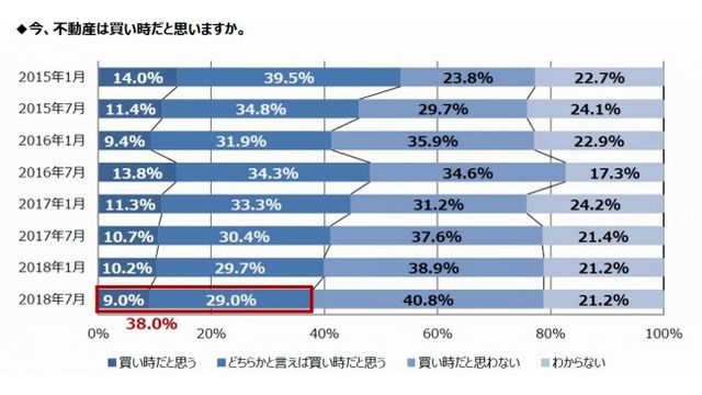 不動産の買い時感について尋ねると、前回比1.9ポイント減の38.0%が「買い時」と答えた。一方、「買い時だと思わない」の回答は同1.9ポイント増の40.8%だった。買い時だと思う理由については、「住宅ローンの金利が低水準」の回答が70.8%と最も高く、買い時だと思わない理由は、「不動産価格が高くなった」が68.8%と最も高かった。