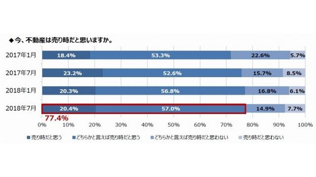 野村不動産アーバンネット(東京都新宿区)は、不動産情報サイト「ノムコム」会員を対象に「住宅購入に関する意識調査(第15回)」を実施し、調査結果を発表した。不動産の売却意向がある323人に「不動産の売り時感」について質問すると、「売り時だと思う」「どちらかと言えば売り時だと思う」の回答が合わせて77.4%(同0.3ポイント増)だった。これは2017年の「売り時」調査開始以降、最も高い回答結果だという。理由については「不動産価格が上がったため」と答えた人が一番多く、次いで「今なら好条件での売却が期待できるから」となった。