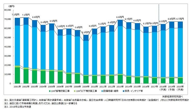 今後、住宅ストック数の増加に伴い「設備修繕・維持関連」分野が拡大、市場全体が安定的に推移していくと考えられることから、2020年の市場規模は2017年比7.4%増の6.7兆円と予測する。