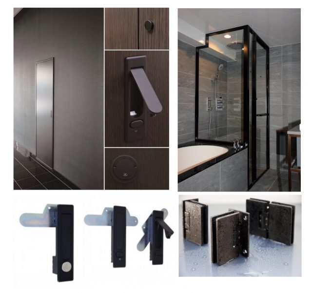バスルームアクセサリーシリーズは、水まわり用ステンレス製品に黒色PVD加工(チタンコーティング)をほどこしたステンレスガラス用調整ヒンジ。耐摩耗・耐食性にすぐれ、浴室のアクセントになる。