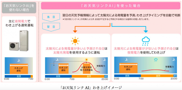 また、翌日の天気予報情報と過去の太陽光発電量データから、AIで翌日の同社太陽光発電システムの発電量を予測する「お天気リンクAI」を追加する。その予測をもとに、同社エコキュートが翌日分のお湯のわき上げに太陽光発電電力を使うかどうかを自動で判断し、夜間のわき上げ運転のタイミングを最適化する。