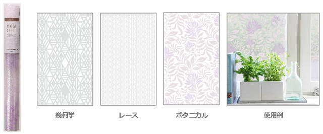 女性からの「いま風なデザイン柄、目隠しにもなる大きなモチーフ柄がほしい」という声に対応。部屋のアクセントにもなる「幾何学」「レース」「ボタニカル」の3種類のデザインを追加した。凹凸のある窓ガラスにも道具を使わず簡単に施工できる。今回は野外から室内が見えにくくなるよう、柄のサイズ・色味にこだわった商品となっている。