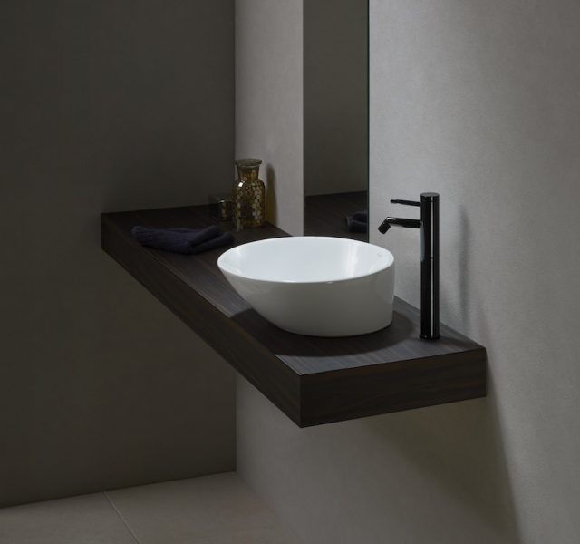 前にせり出したデザインの「GEO(ゲオ)」(VR4421)[写真上]は、高さのあるベッセルタイプの手洗い器。ボウル面を広くすることでカウンターへの水はねを軽減する一方、底面を小さくすることで限られたスペースにも取り付けられるようにした。