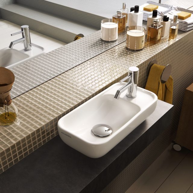 「PASS(パス)」(FLPS40)[写真下]は、スイス・FLAMINIA社の丸みのある小さな手洗い器。水栓を本体に設置するインセットタイプで、手洗い器のまわりに水返しがあるためカウンターに水がこぼれにくい。