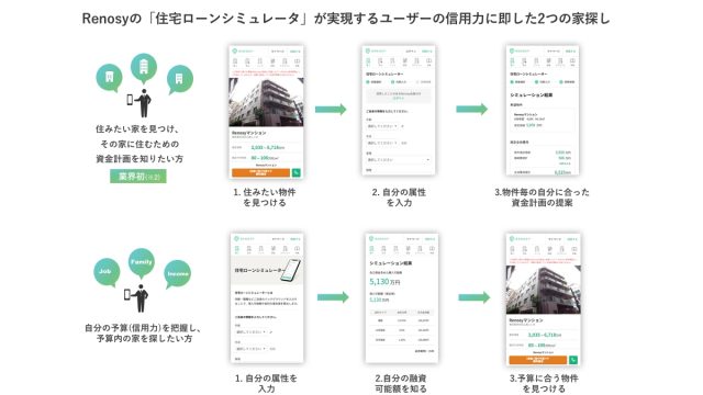 MFSが提供する住宅ローン借り入れ可能額推定サービス「モゲスコア」を「Renosy」とAPI連携させることで、「Renosy」のユーザーは物件検索時に自身の住宅ローン借り入れ可能額を把握し、毎月返済額などが表示された資金計画表を物件ごとに確認できるようになる。これにより、ユーザーは自身の資産背景やライフスタイルに即した物件探しをすることが可能となる。