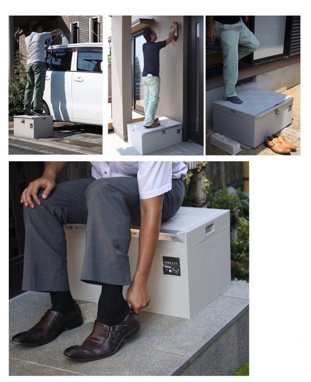 独自の高耐久・高気密樹脂素材(ポリオレフィン樹脂+炭酸カルシウム)を採用することで、外部使用でも10年以上の耐久性を実現。フタはハニカム構造とし、耐荷重100kgのため、たとえば玄関先のベンチや段差解消ステップ、洗車や電球交換時の踏み台などとしても利用できる。
