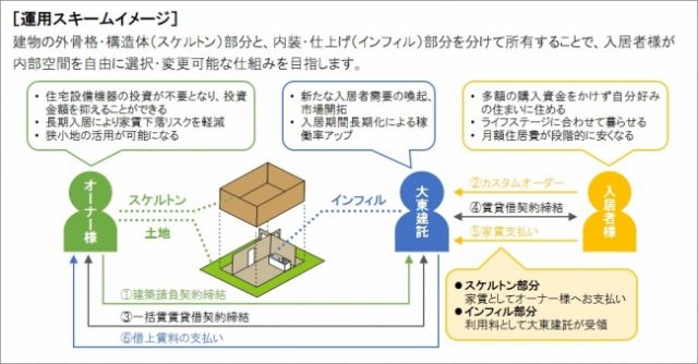 「cocoDaTe」は、同社が土地オーナーと建築請負契約・一括借上契約を締結し、土地オーナーが建物の外骨格・構造体(スケルトン)部分、同社が内装・仕上げ(インフィル)部分をそれぞれ所有するスキーム。入居者との間では間取りや内装のオーダーを受け、賃貸借契約を締結する。