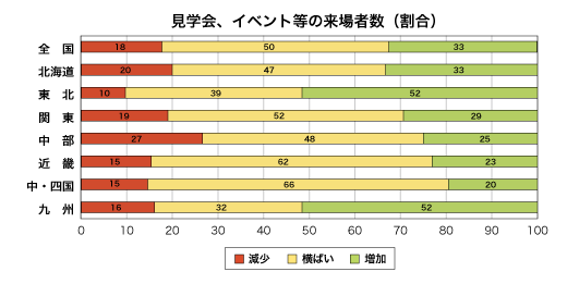 見学会、イベント等への来場者数は、『増加』の回答が前四半期の26%から33%に上がり、『減少』が20%から18%に下がり、回復傾向となった。引き合い件数は、『増加』が18%から28%に上がり、『減少』は20%から13%に下がった。